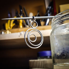 Médaille en forme de goutte sur laquelle a été brasé un serti clos contenant une labradorite carrée. La médaille a été percée puis un anneau de fil demi-jonc entoure ce trou permettant de faire passer la bélière de fil rond. Un cerf a été évidé sur l'arrière de la pierre, laissant apparaître d'autres reflets.